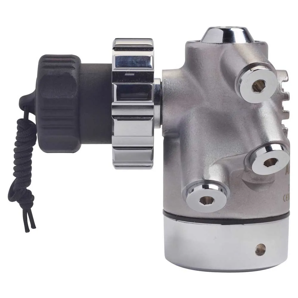 The Airstream Overbalanced and Environmentally sealed first stage is made through a forging process allowing optimized hose routing. The low pressure ports are angled 30 degrees down and 23 degrees out to allow hose routing directly over the shoulders. The high pressure ports are angled down 45 degrees to keep gauges closer to the divers hip and body. This process also allows air flow to be channeled through larger passages combined with the overbalanced diaphragm creates the lowest Work Of Breathing effort (WOB) 0.80 Joules per liter in all conditions and temperatures. Built into the front of the body of the Airstream is a forged heat transfer keeping warmer air inside and forcing cold out allowing this regulator to perform in the coldest conditions where others fail.