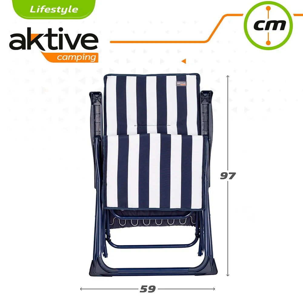 It folds completely and has 5 positions that you can adjust through the navy colored PVC armrests.