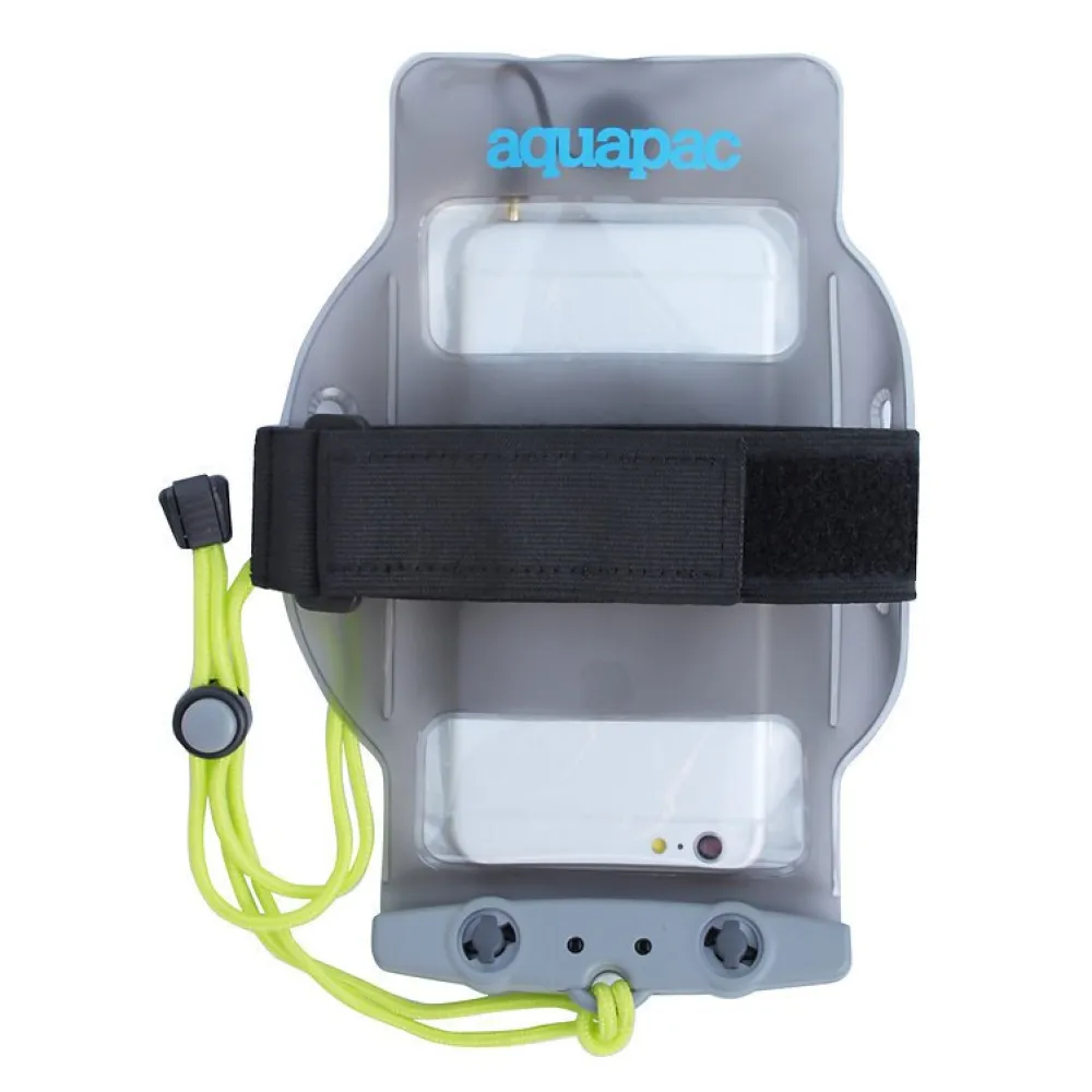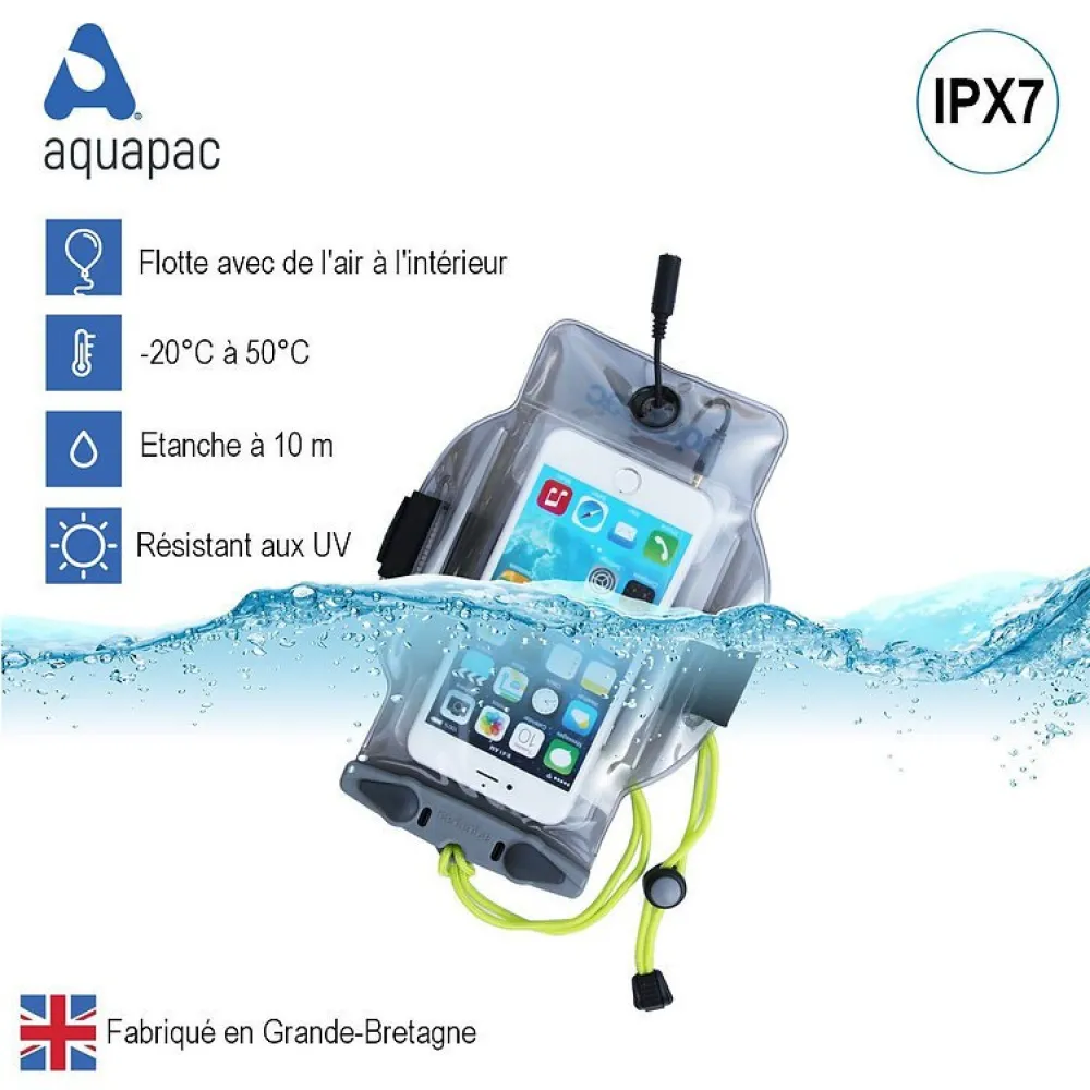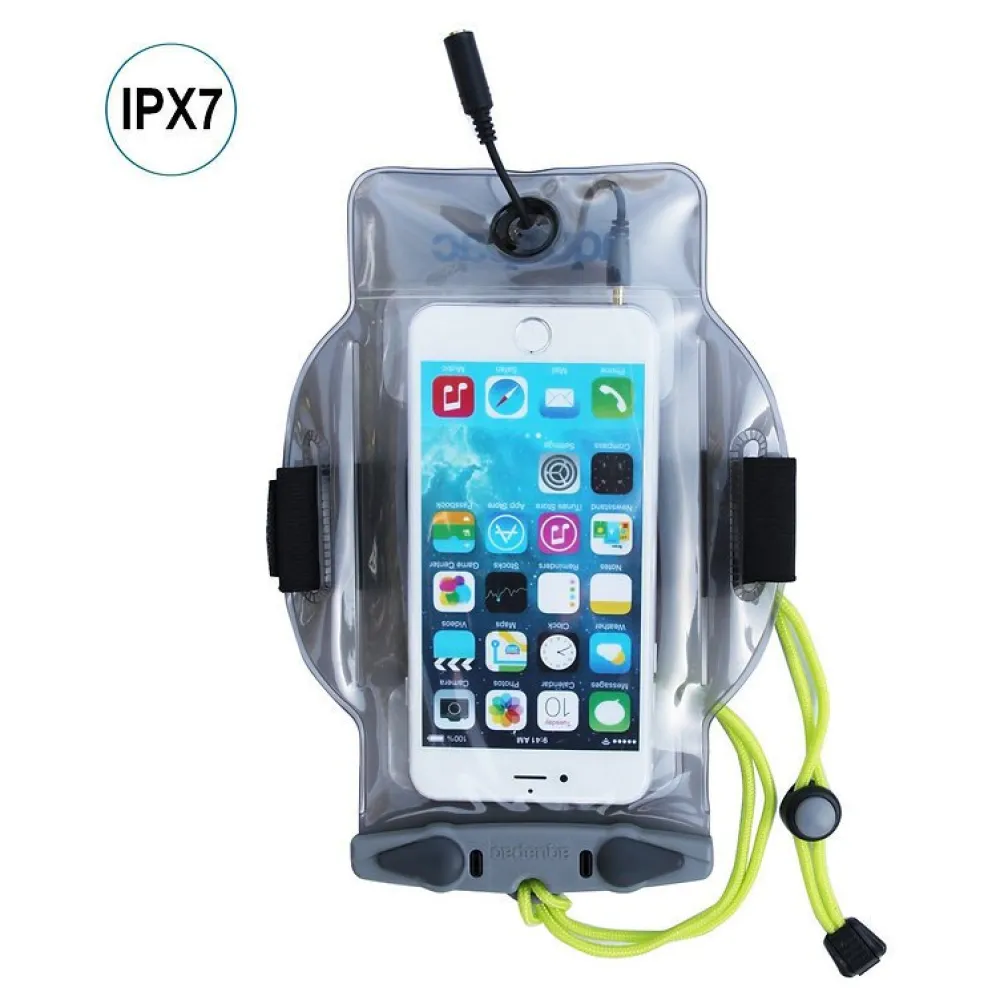 Submersible to 1 meter – IPX7Made from UV resistant biodegradable TPU. Tested and used by professional windsurfers and kite surfers around the world Features:The headphone jack allows you to listen to your music while you´re on the bike or on the water.It comes with an armband and an adjustable cord, so you can hang it around your neck or wear it on your arm.Both are detachable.You´ll be able to talk and hear through the case with no problem, take great photos and videos through the LENZFLEX window, and your touchscreen will work normally too.It´s not only 100% waterproof, it also protects your phone from dust, dirt and sand. Useful to know:The headphone jack is a standard audio only jack, which means you can listen to music but not have phone conversations with your headphones, the microphone does not work.Some smartphones can be very sticky. If your phone is shiny and sticky, pinch the corner of the case and shake it to get your phone in and out.Some phones will float in this case, others will not. Be sure to test yours in a basin before you throw it in the sea!”Touchscreens don´t work underwater, water breaks the circuit. But you can use the volume buttons to operate your camera underwater.Fingerprint recognition, such as Apple´s Touch ID, will not work with theAquapac. You will need to enter your passcode.Some phones have quite sharp edges. We recommend using a thin case that will protect both the phone and the case. Note: Velcro® is a registered trademark of Velcro Industries B.V.