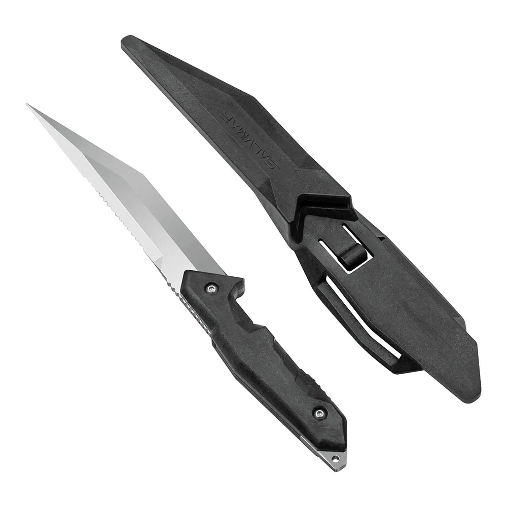 Serrated profile to scale the fish, V-shaped scabbard for easy blade insertion.