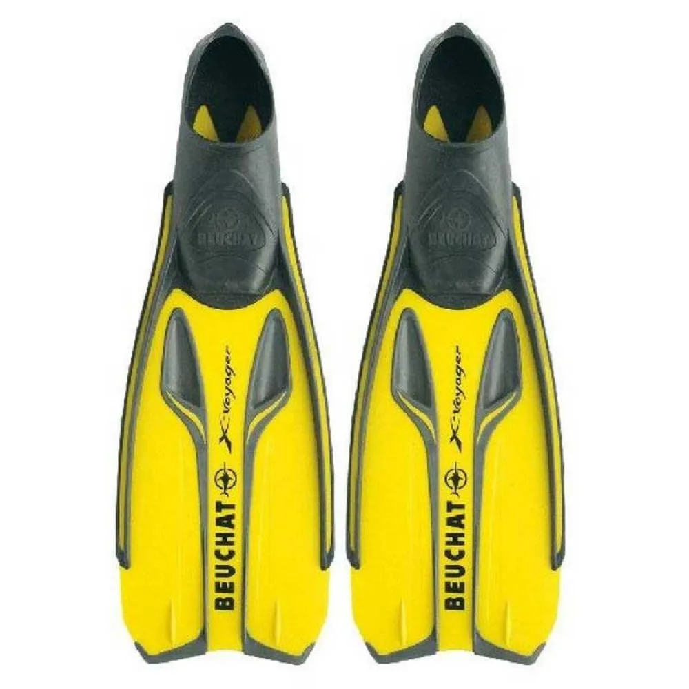 Tough, flexible bi-material full foot fin > Extra comfortable anatomical foot pocket > Exclusive Beuchat flexible Power Jet technology significantly reduces the negative zone without stiffening the blade > Flexible protection around the edges of the blade > Stabilizers at blade tips for precise movement.