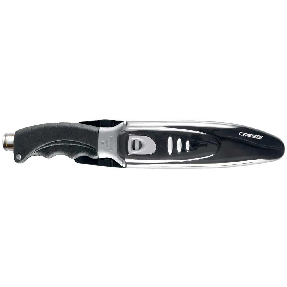 – One side of the stainless steel blade is straight-edged, the other one is serrated right along the blade; they are both very sharp and effective for line cutting.