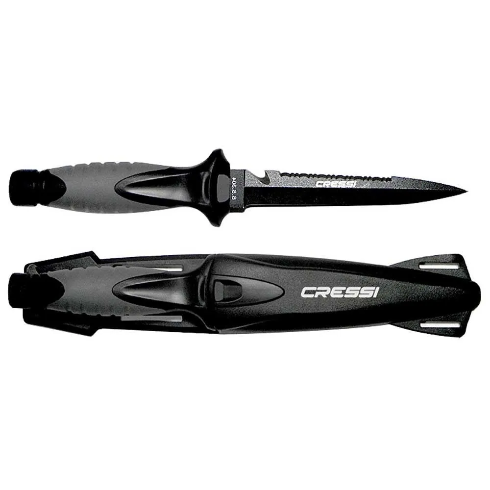 Medium-sized stiletto knife designed for underwater fishing. Manageable, high blade penetration and durability with a secure grip. The blade extends through the interior of the handle and, at the end of the handle, has a small pommel. Tempered AISI 304 steel with Black Coating. The duration of these features is guaranteed not by the sharpness itself, but by the quality of the material that guarantees the durability of the blade. Rhomboidal cross section for greater resistance to flexing and breaking. Double-edged blade with one smooth-edged side and the other serrated. Comfortable handle with rubbery polymer coating. Plastic sheath, very hydrodynamic with a rubber ring knife attachment. Calf attachment using two elastic straps (included).