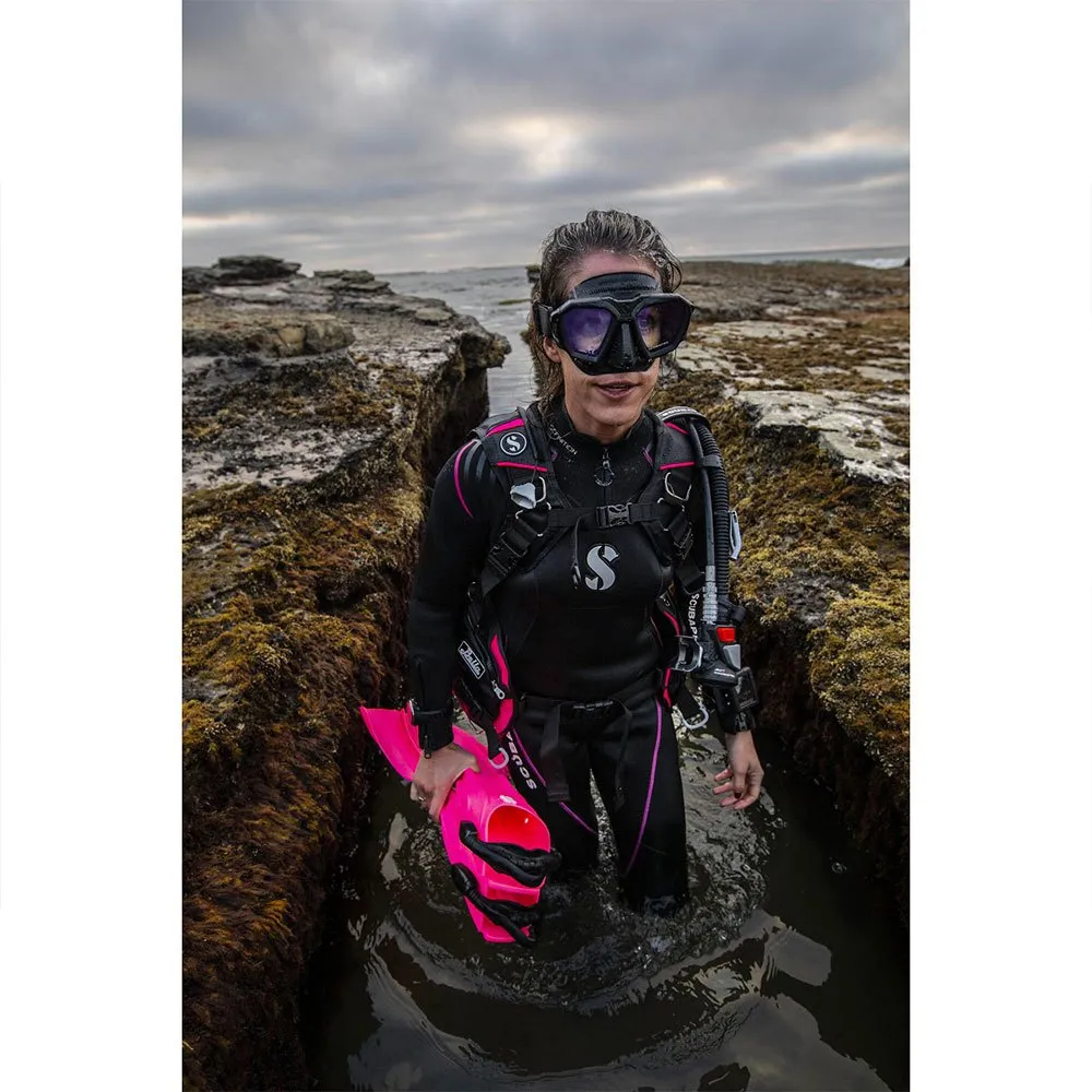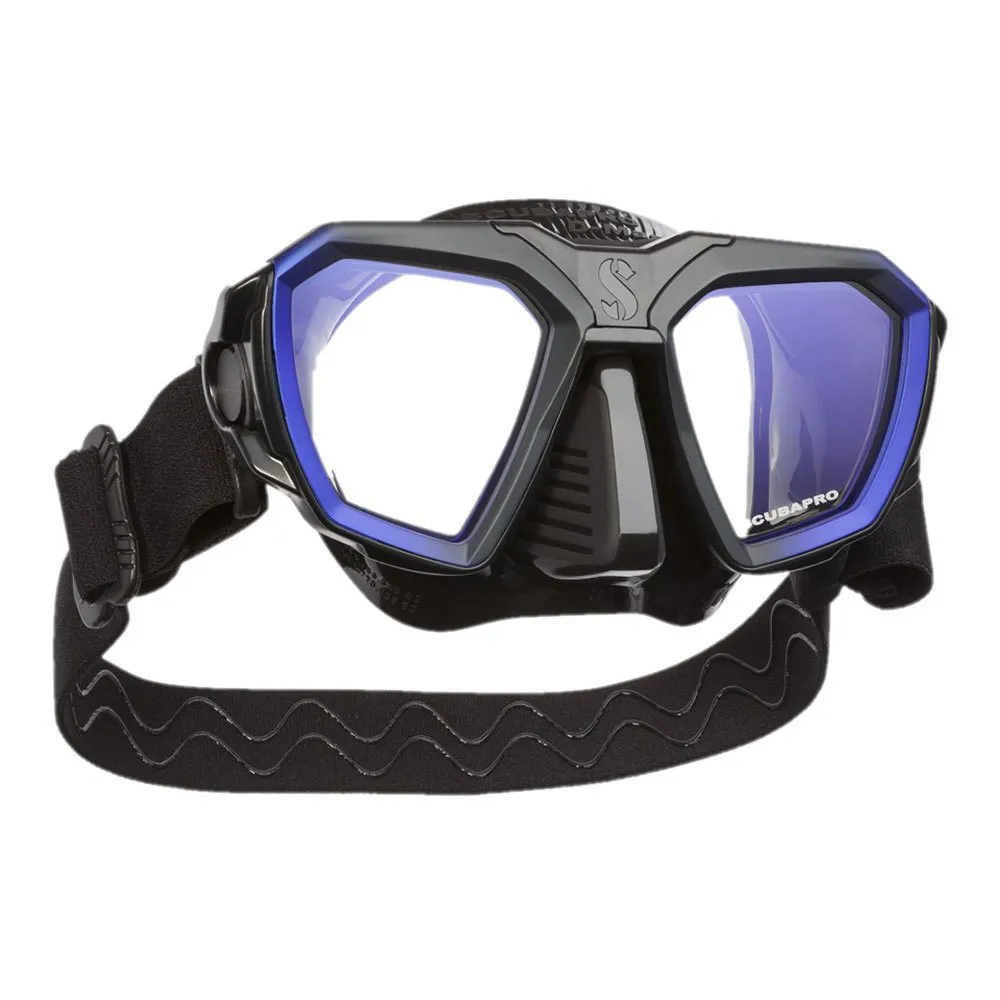 Sharing the design scheme of the new D-Series D420 regulator, the new D-Mask is a sleek, premium mask well-suited for all types of diving. It is equipped with UV+420cut™ lenses that fi lter out high-energy visible (HEV) light as well as UV light without aff ecting how colours appear under water. It is also the only premium mask that features an interchangeable lens system for optional optical lenses. The D-Mask is available in black with blue accents to match the D420 regulator’s colour scheme. It comes with a choice of black or clear skirts in two sizes: Medium or Small as well as a special wide fi t. Also included is a new black-on-black Comfort Strap, a black mask frame and an adapter for mounting a HUD hands-free dive computer.