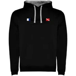 Two-colour hoodie with double fabric, contrasting adjustable drawcord.