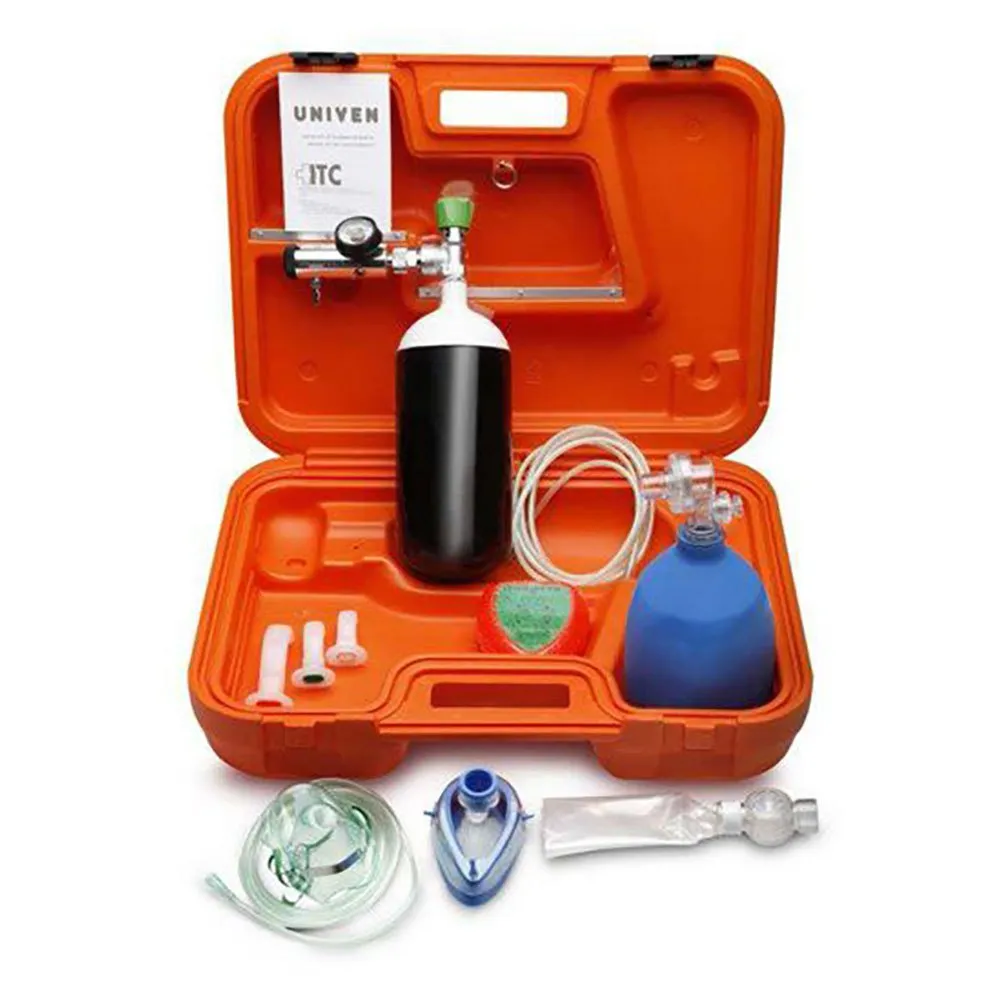 UNIVEN manual resuscitator with overpressure limiting valve, adult mask, extension tube to connect to the flow meter and reservoir bag.