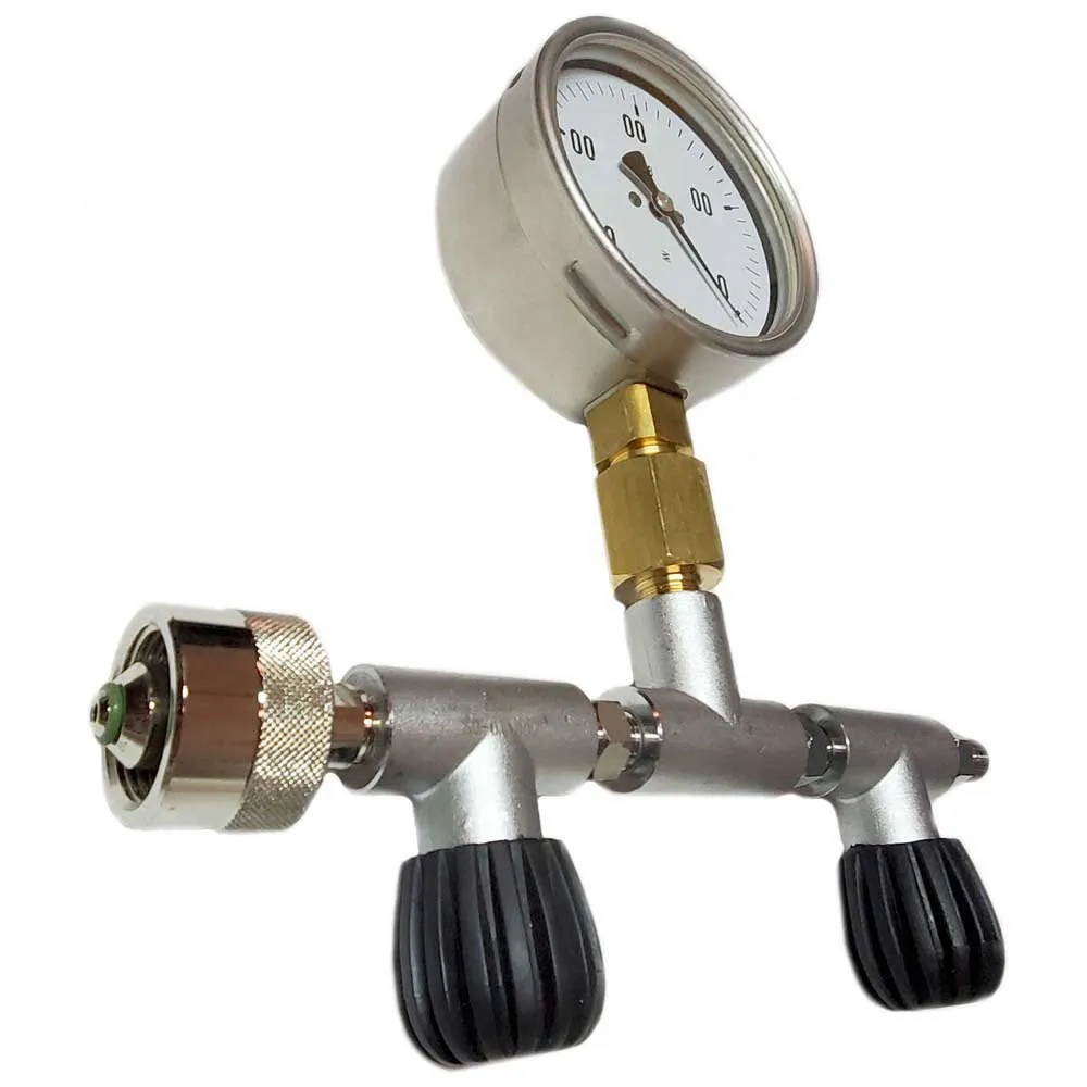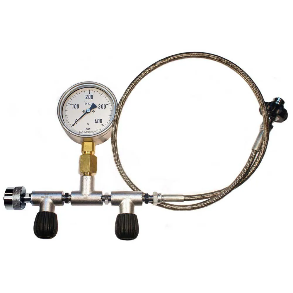 Oxygen Equalizer NEVOC W30x2 connector to DIN 200/300 with flow control and purge, stainless steel braided hose. Pressure gauge clase 1.0 in 100 mm diam.