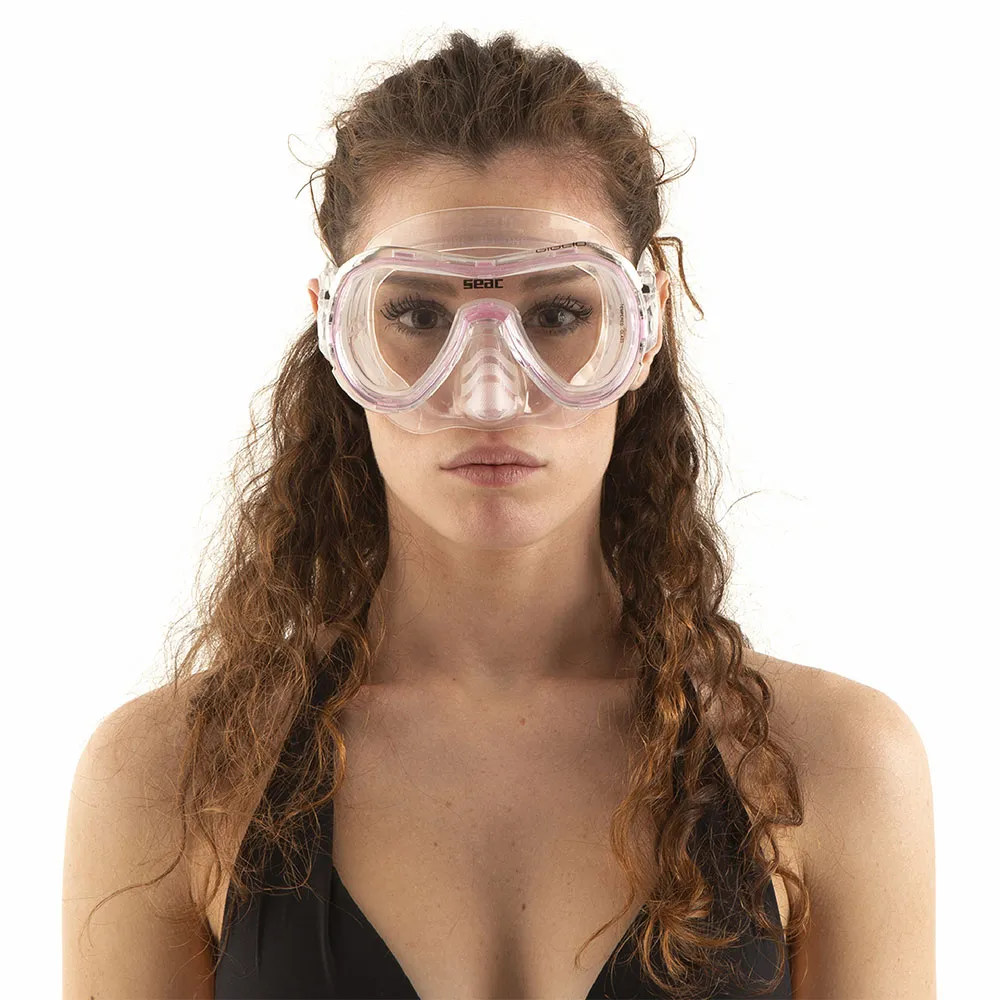 Single-lens mask with tempered glass and colored silicone skirt, designed to provide a better fit for narrower faces and for children.