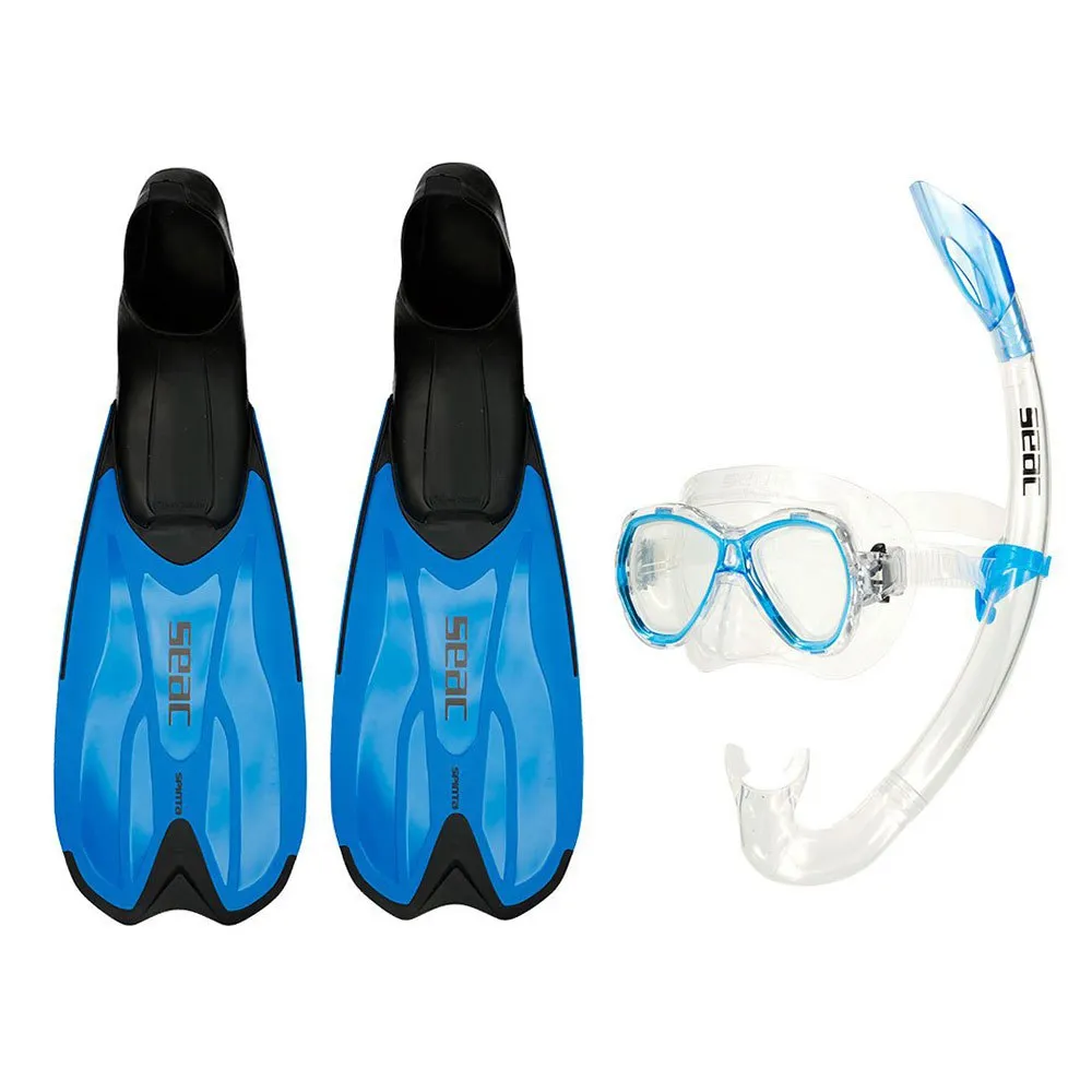 Set includes Spinta full-foot fins, a Bella silicone mask, and a Tribe snorkel with valve.