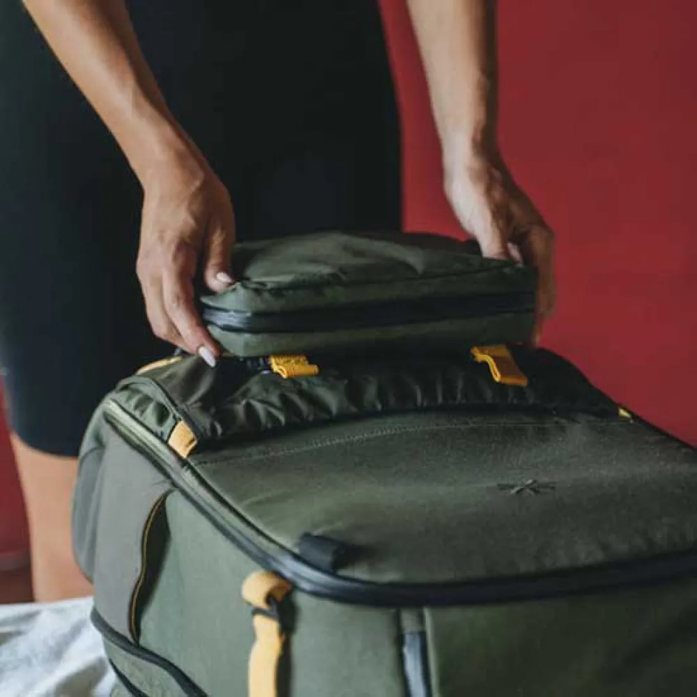 Attach it to the front of the Shell backpack so it doesn’t take up space inside your bag. Designed to be an optimal size for all your toiletries and hygiene essentials. Easy full open access with double zipper and you can hang it up with the attached hook if needed. Includes a mesh zippered top compartment and open mesh compartment. Water and leak proof.