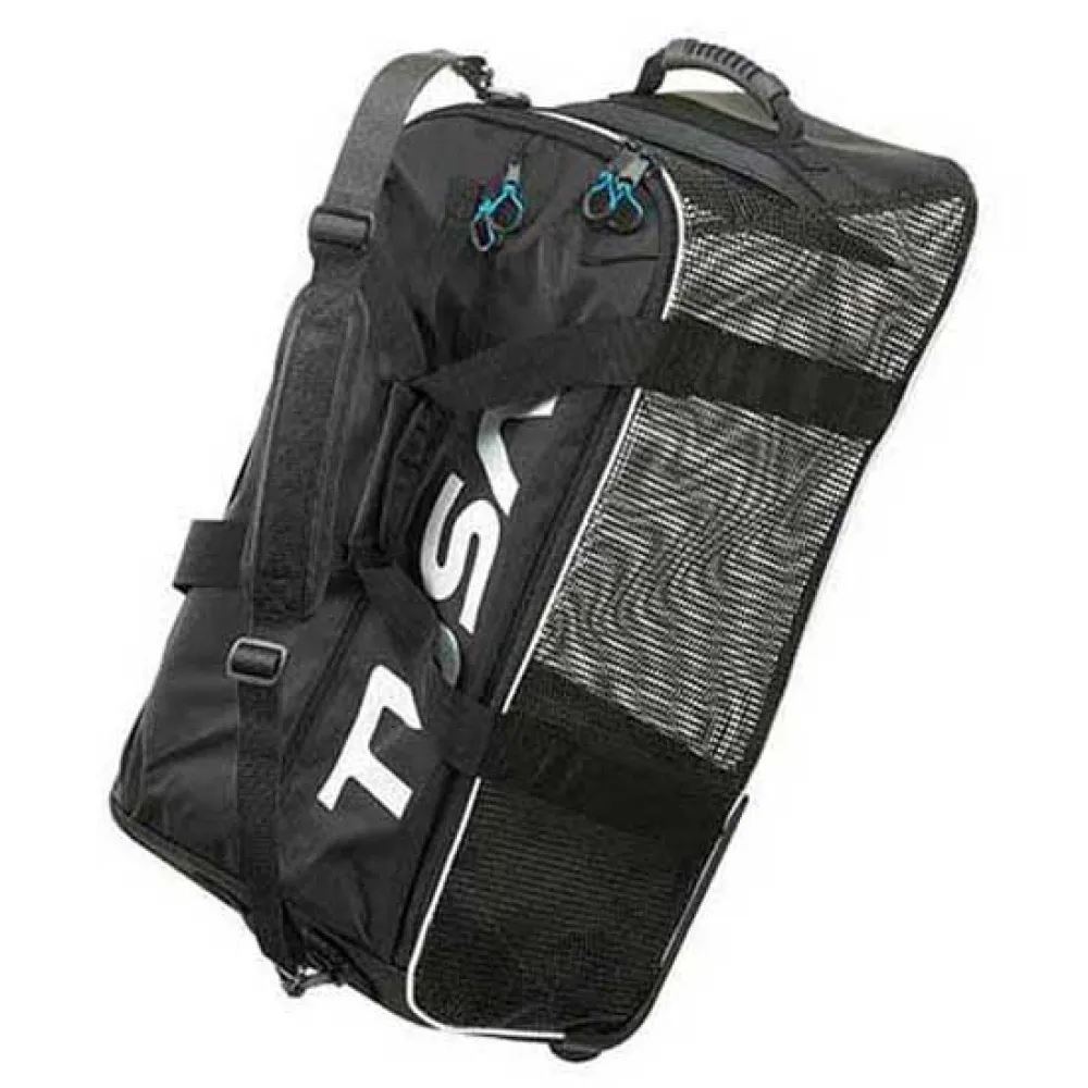 The BA0301 Mesh Roller Bag provides ample room for a full set of dive gear. Durable rubberized mesh and an oversized main compartment opening make this the perfect duffle bag for watersports. Durable smooth gliding wheels are a great addition to the bag as well as an internal pocket, shoulder strap and two heavy duty carry handles.