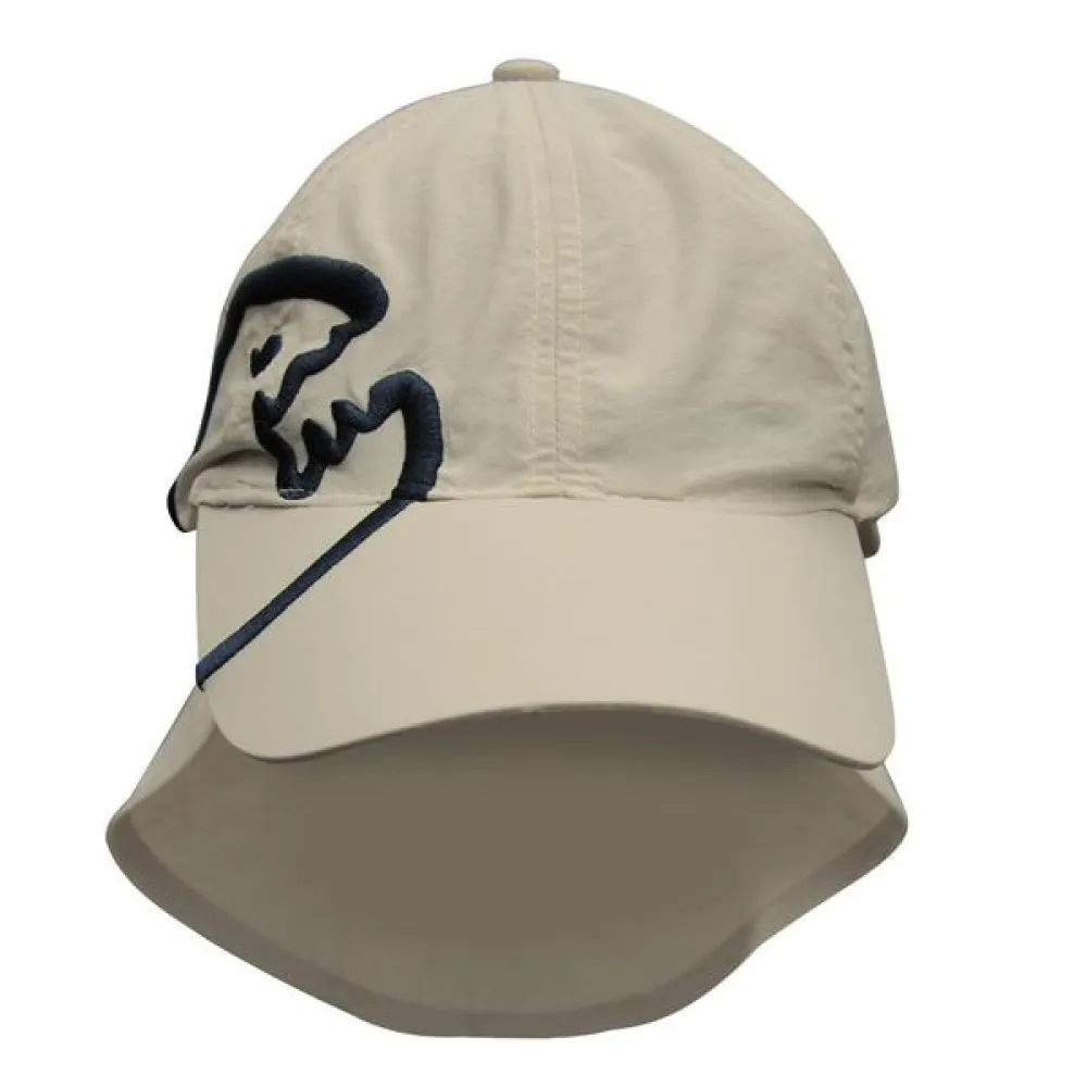 With neck protection; stow away the neck protector under the cap when you dont need it. Peaked cap with neck protector that can be stowed away when not required.