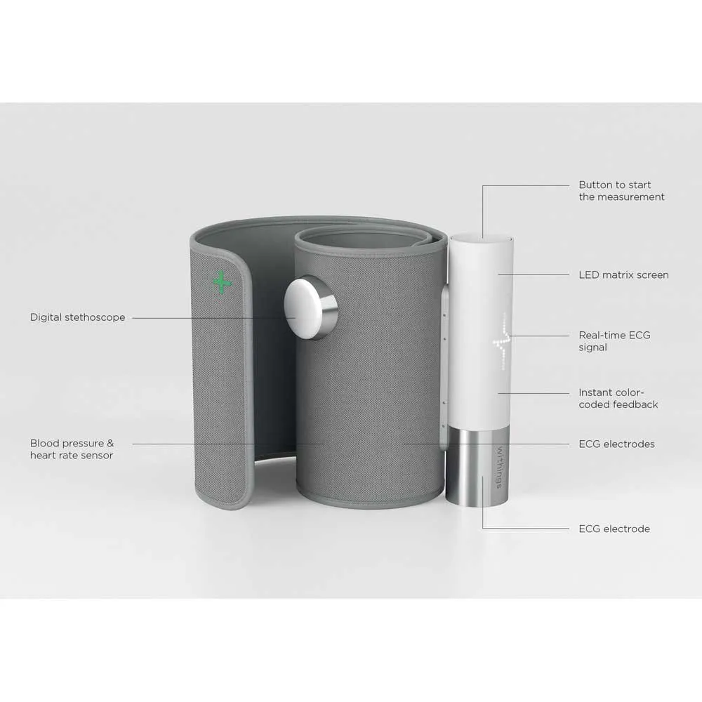 – Usage instruction : The cuff should be placed on the left arm, on bare skin. The measurement is done in two stages: first the blood pressure measurement, and second the ECG and stethoscope measurement, for which users need to place their hand on the metal electrode. The digital stethoscope should be located against the users’ chest during the measurement as it listens to the heart.