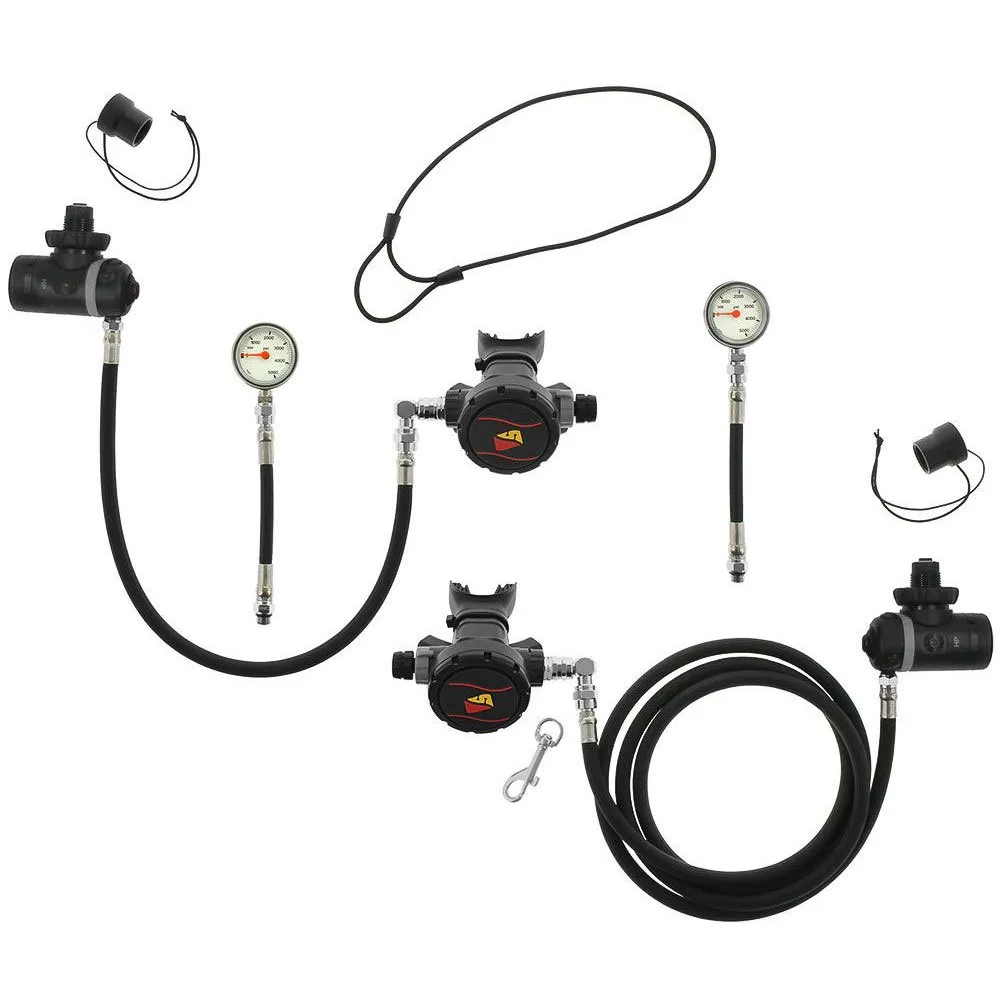 Our braided Airflex hoses makes hose management easy and come standard with the XT2 Sidemount Regulator Package set up. Six inch SPGs can be mounted up or down, depending on diver preference for viewing ease.